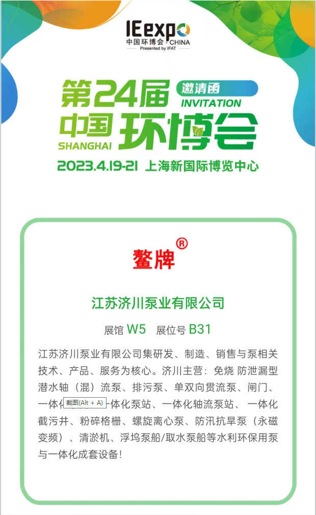 Invitation to Shanghai Environmental Expo April 19-21 April 19–21WEIR JICHUAN PUMPS (JIANGSU)Sincerely invites you to visit the 24th China Environmental Expo 2023 Hall W...